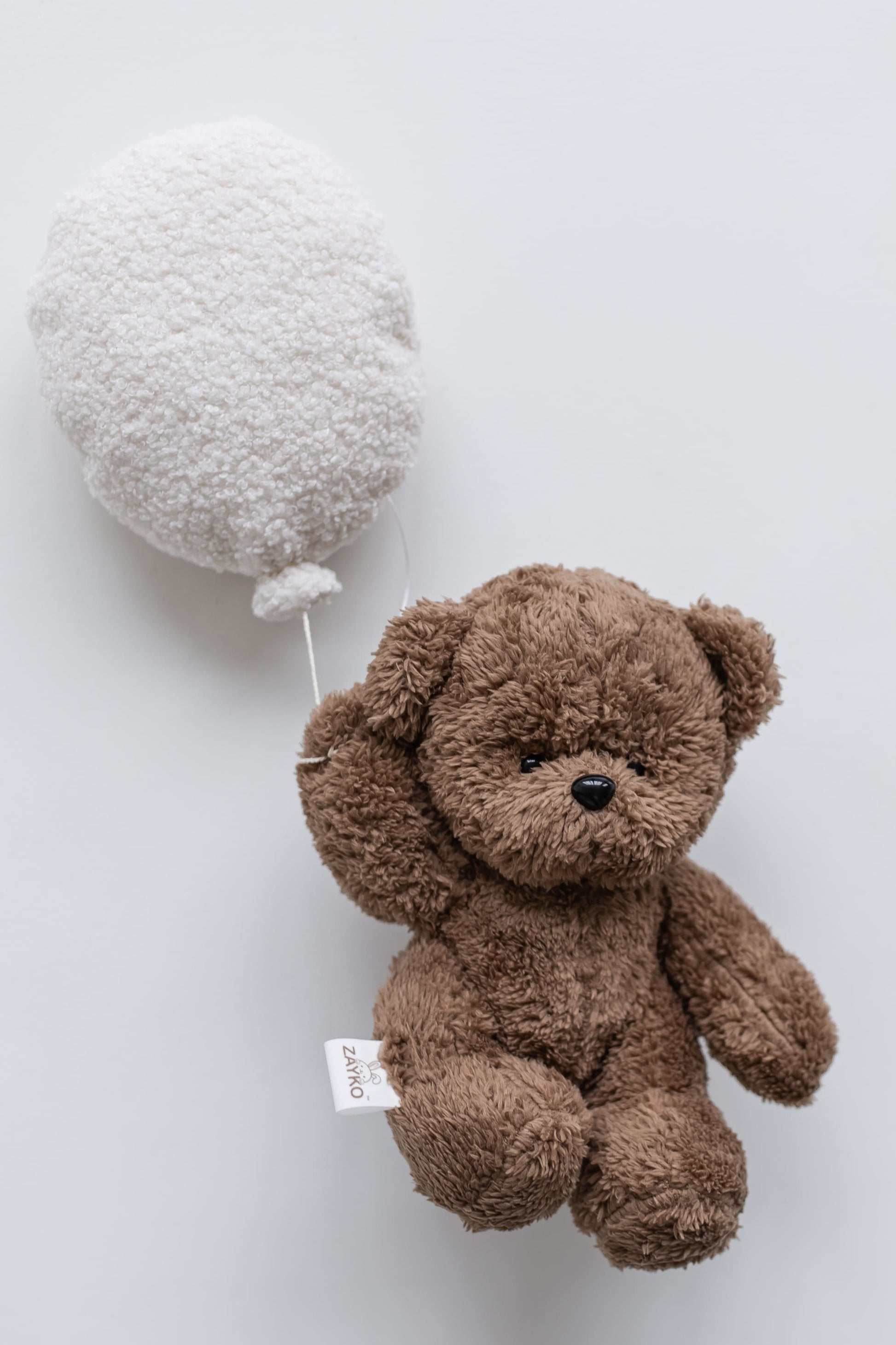 The balloon has a small hook with a carabiner where you can attach a soft plush toy: teddy bear or bunny (both available in two colors).
