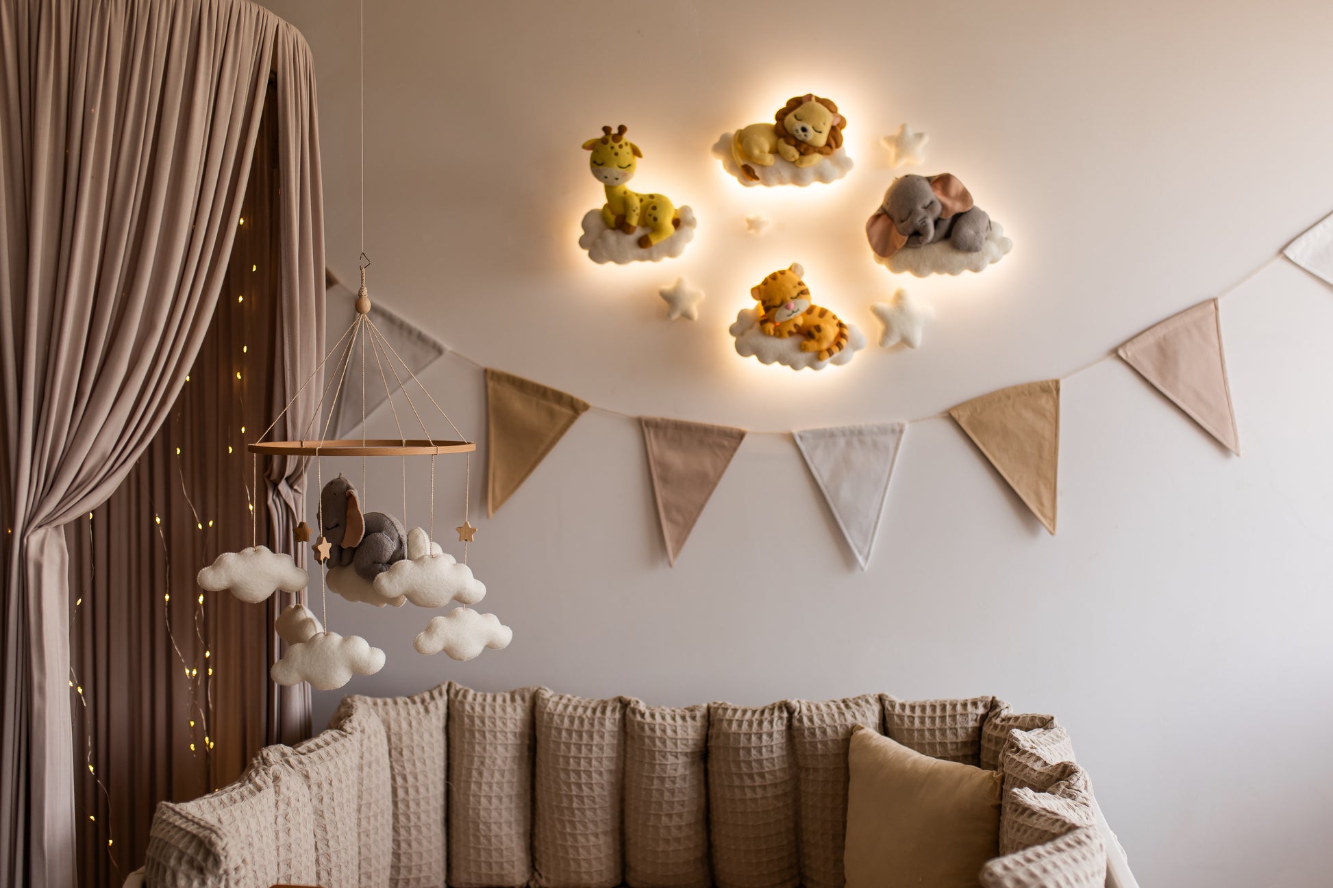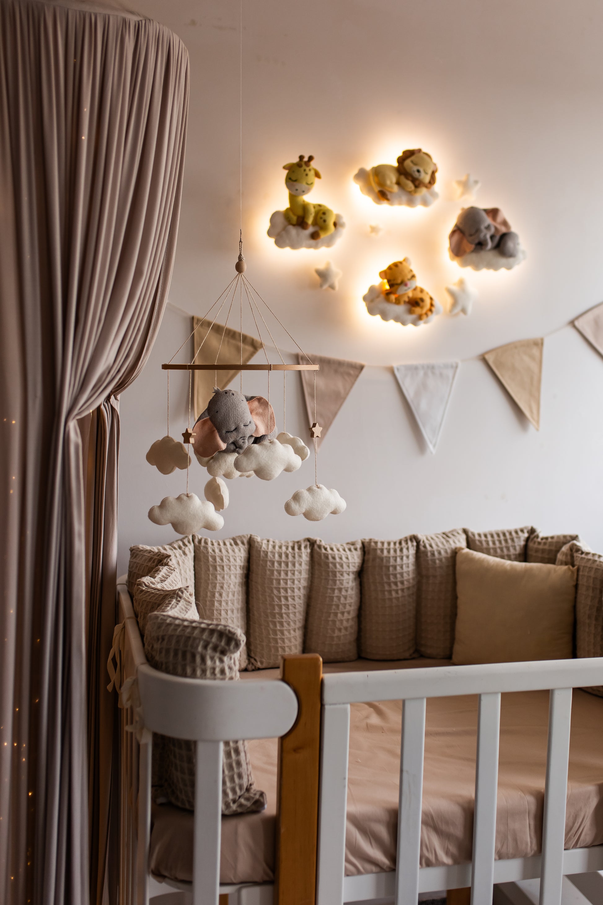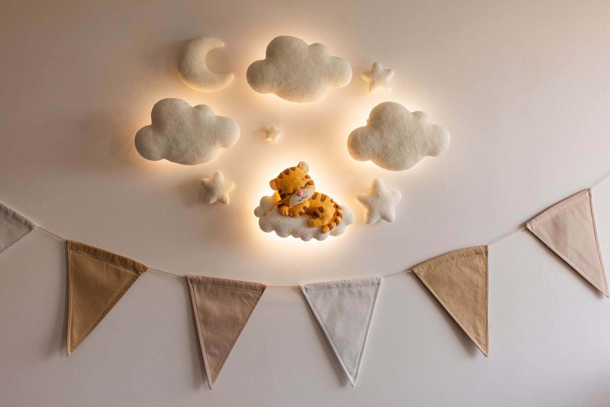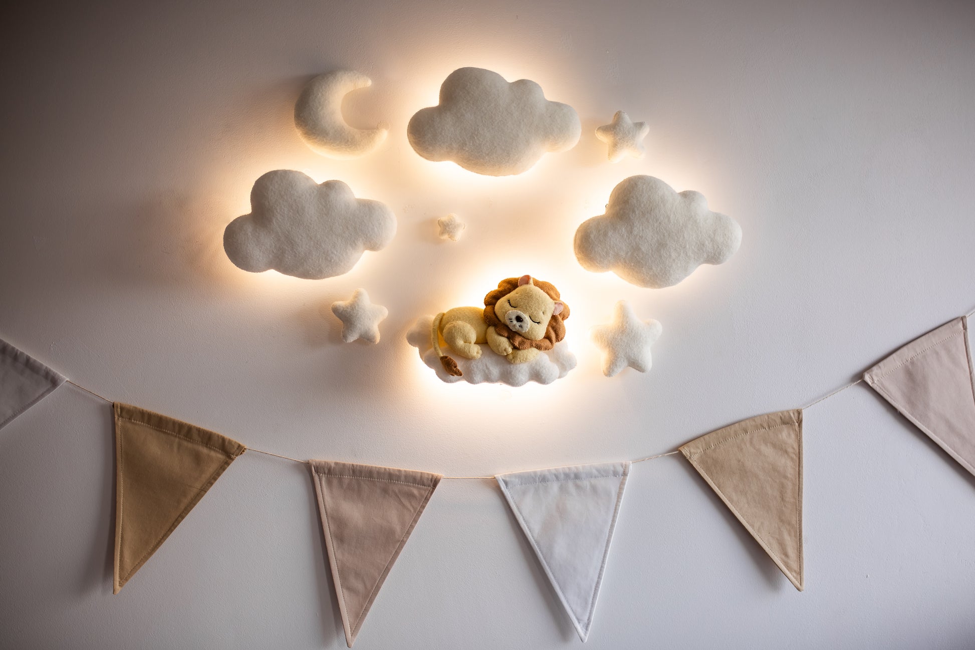 Lovingly made in Ukraine using eco-friendly materials, this piece features premium bouclé fabric and safe, battery-powered LED lighting. CE/UKCA-compliant and secure for display, it is an ideal baby shower gift and a keepsake that evolves alongside your child. Want to match your nursery palette? Custom color options are available—please reach out to personalize your piece.