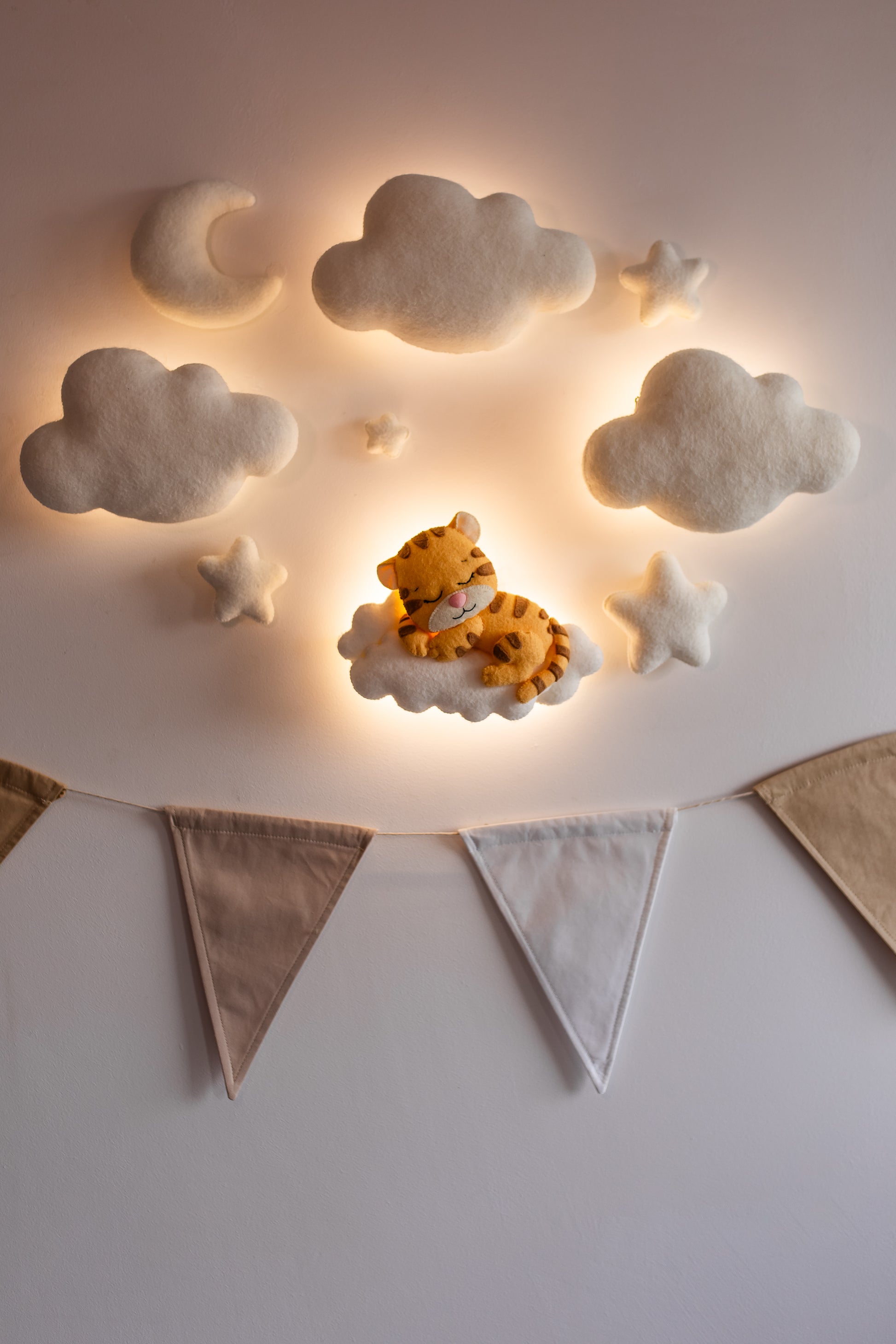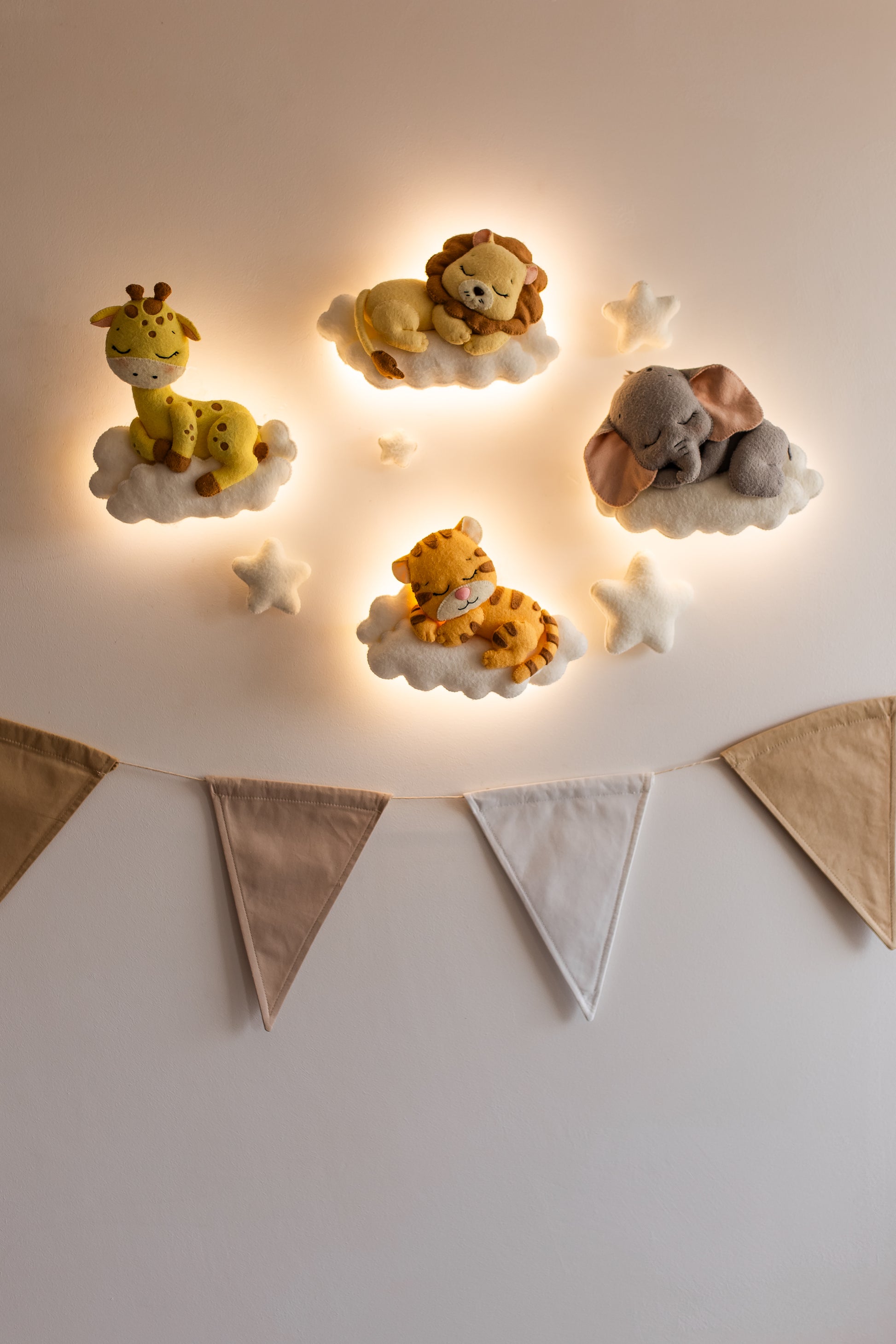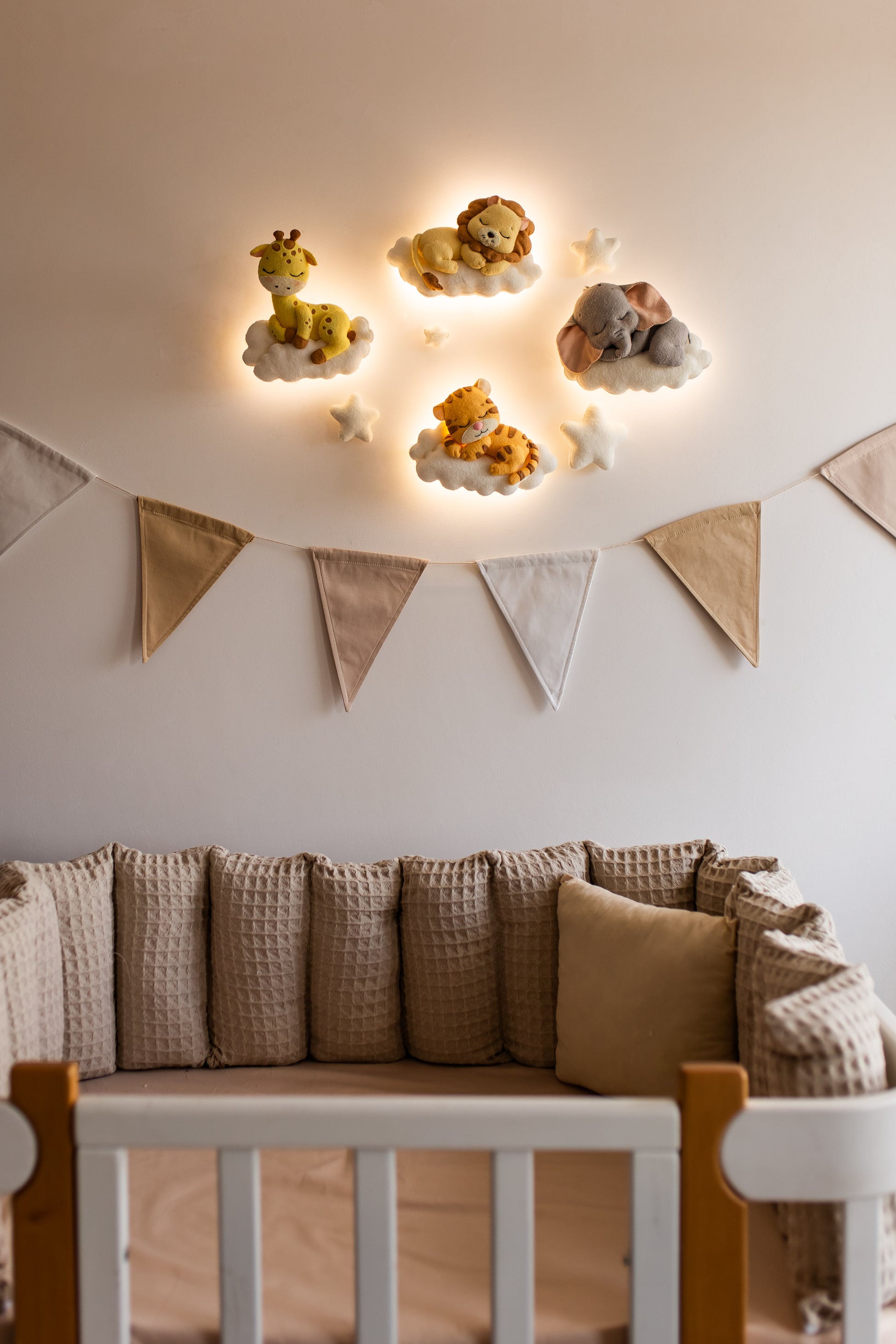 Create a dreamy and comforting atmosphere in your nursery with our Wall Soft Light Set – Safari animals , Clouds & Moon. This handcrafted wall décor combines soft bouclé fabric elements—including an adorable safari animals, crescent moon, fluffy clouds, and twinkling stars—with a gentle built-in LED glow, serving as both charming decoration and soothing night light. Easy to hang, it fits beautifully into boho, Scandinavian, or gender-neutral nursery themes, adding warmth and serenity to your baby’s space.
