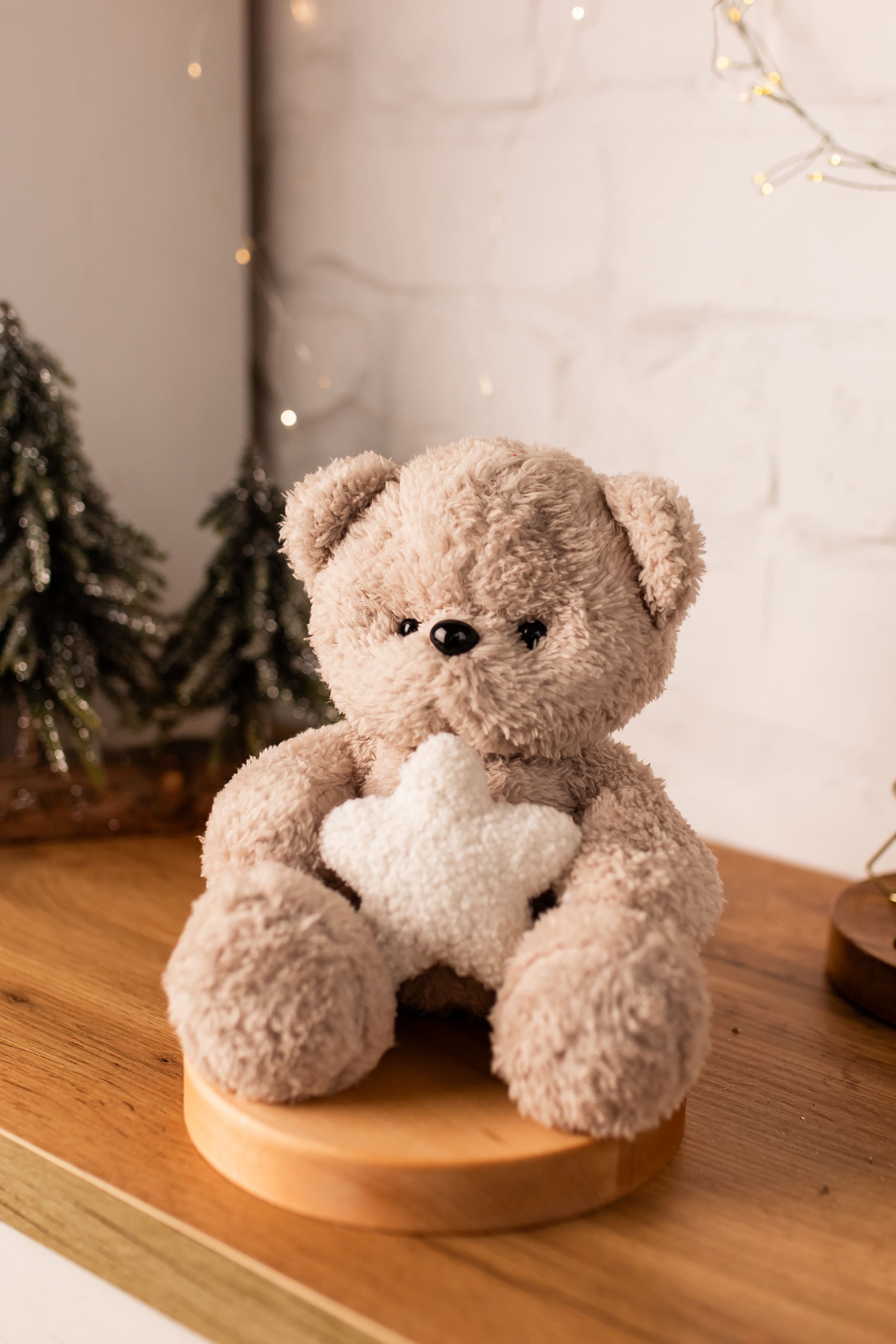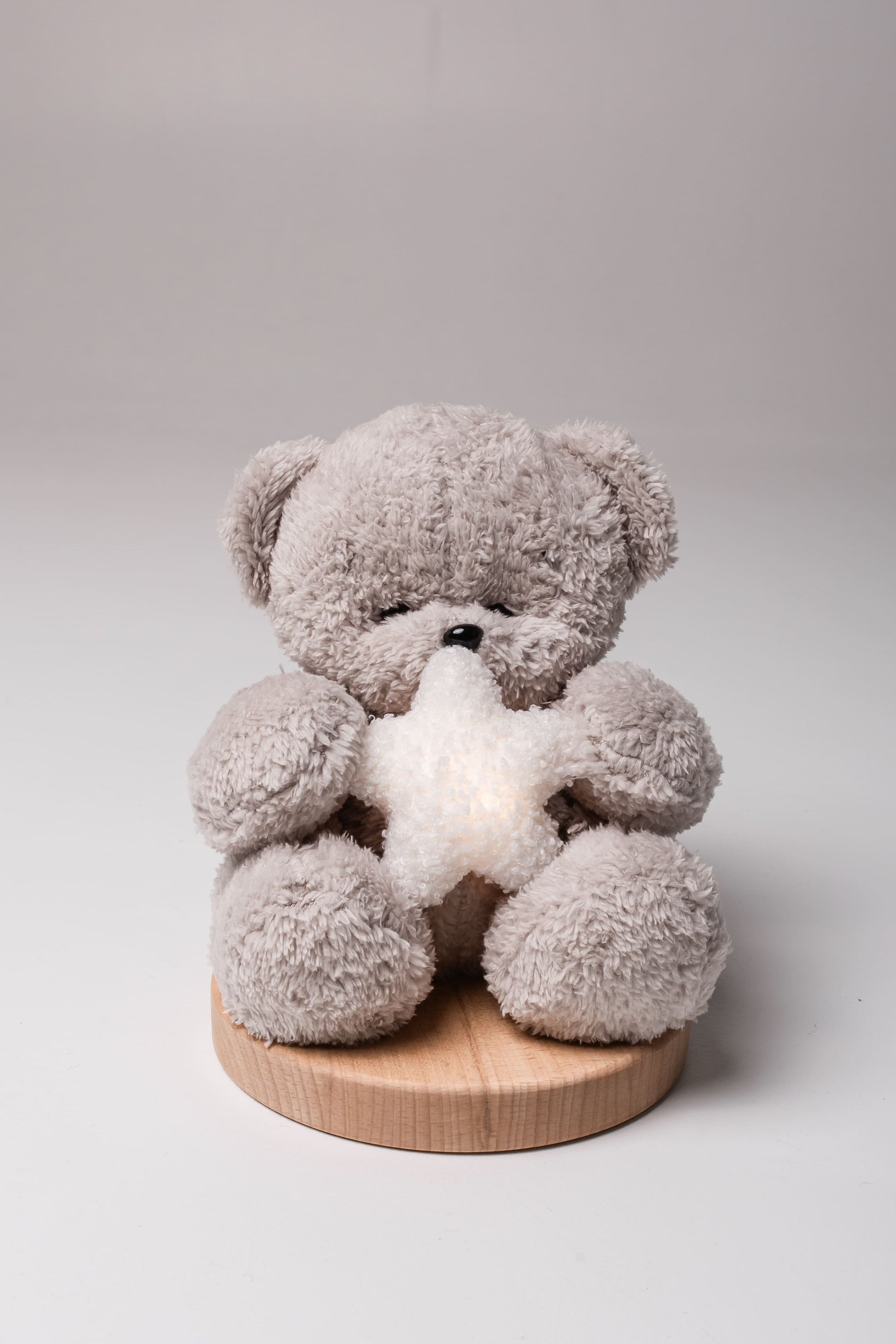 The soft plush bear gently hugs a glowing star, emitting a warm, calming LED light that’s perfect for nighttime routines without disturbing sleep. Crafted with premium materials and a natural wooden base, this lamp blends function and gentle nursery charm — a beautiful piece of decor and a soothing companion for little ones.