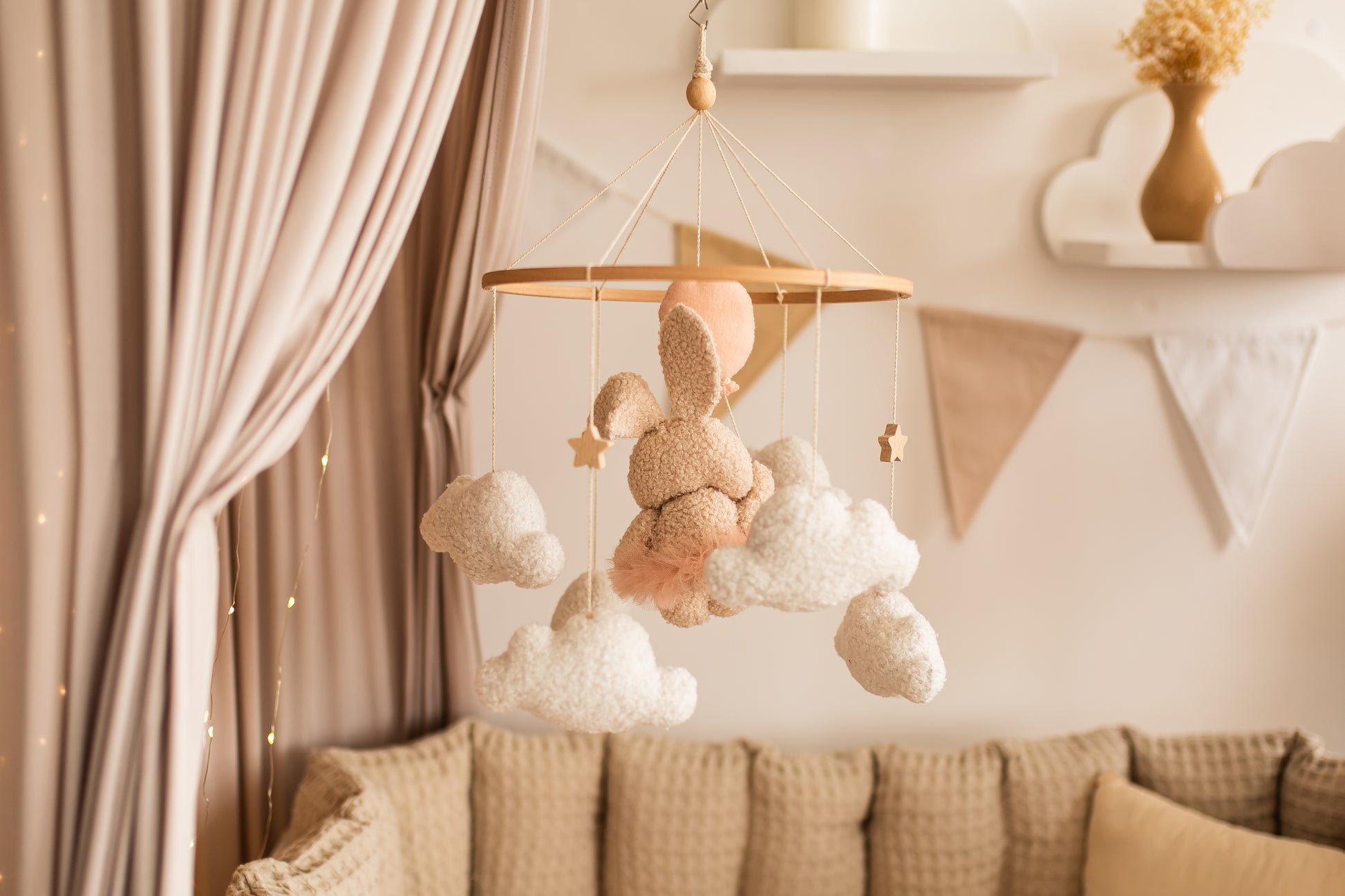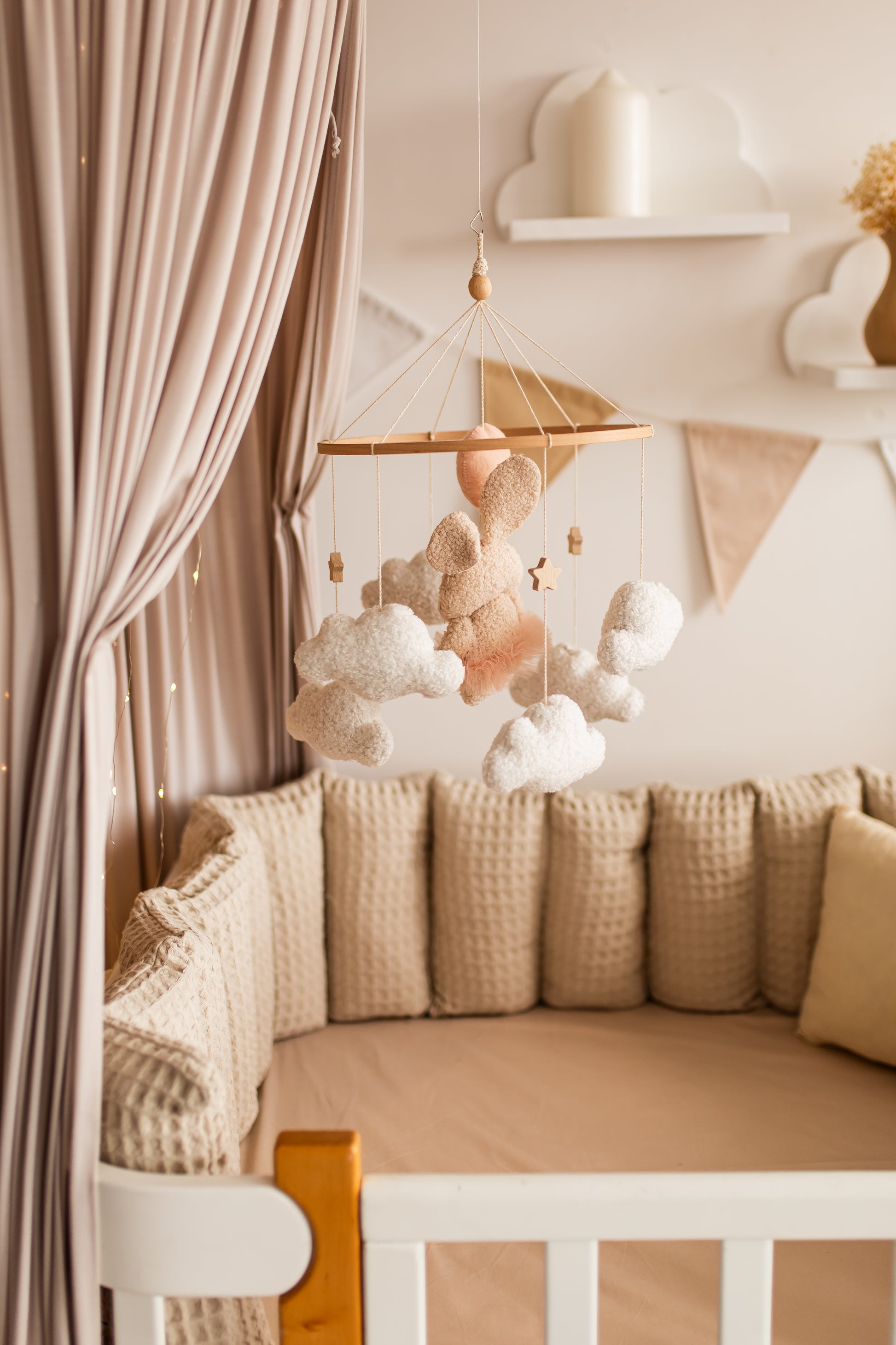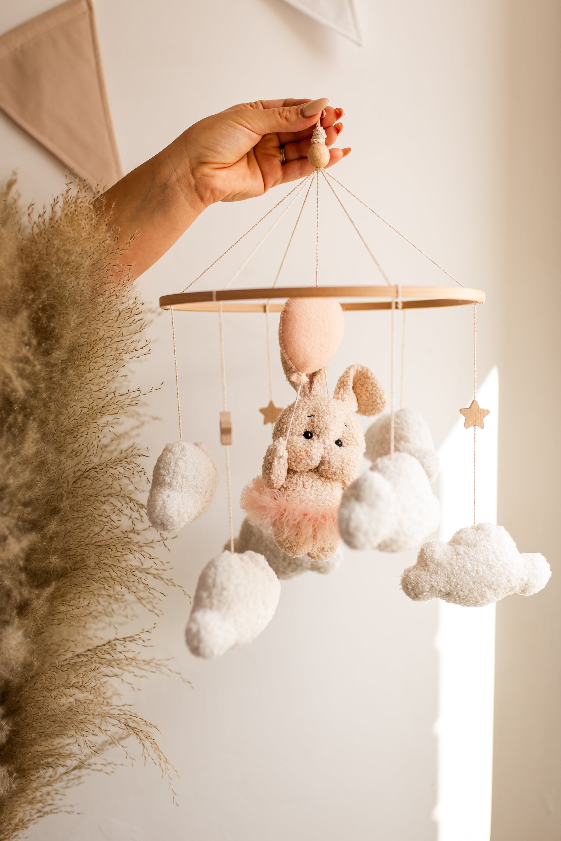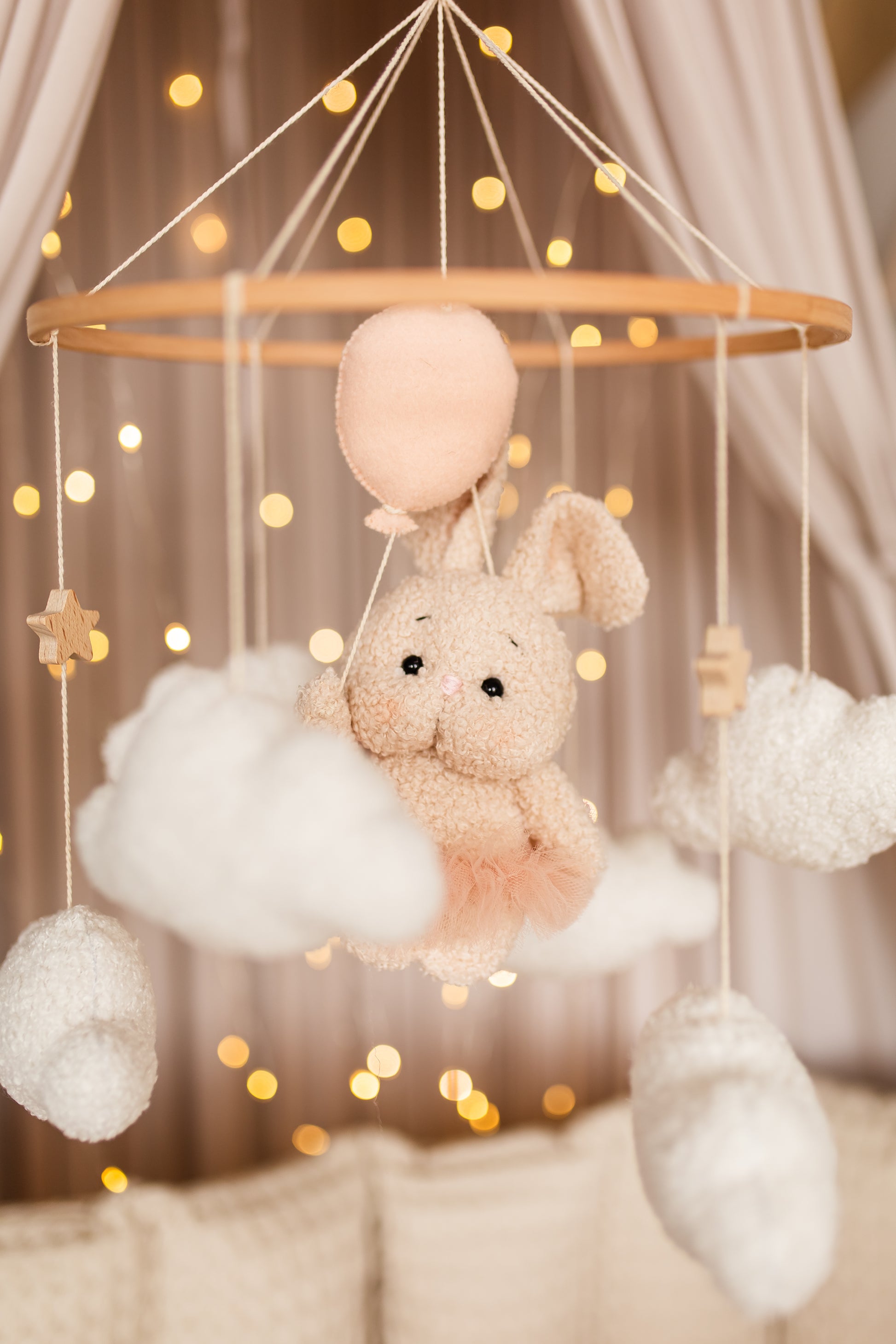 Оживіть декор вашої дитячої кімнати за допомогою нашого дитячого мобіля «Зайчик з повітряними кульками» — химерного поєднання плюшевого зайчика з букле, що ширяє на ніжних повітряних кульках серед м’яких, пухнастих хмар. Виготовлений вручну, щоб викликати мрії, цей чарівний мобіль створює безтурботну та чарівну атмосферу над ліжечком або пеленальний столик, ідеально підходить для бохо, гендерно-нейтрального дизайну або дизайну дитячої кімнати. Його ніжний рух та заспокійливі текстури радують як новонароджених, так і батьків.