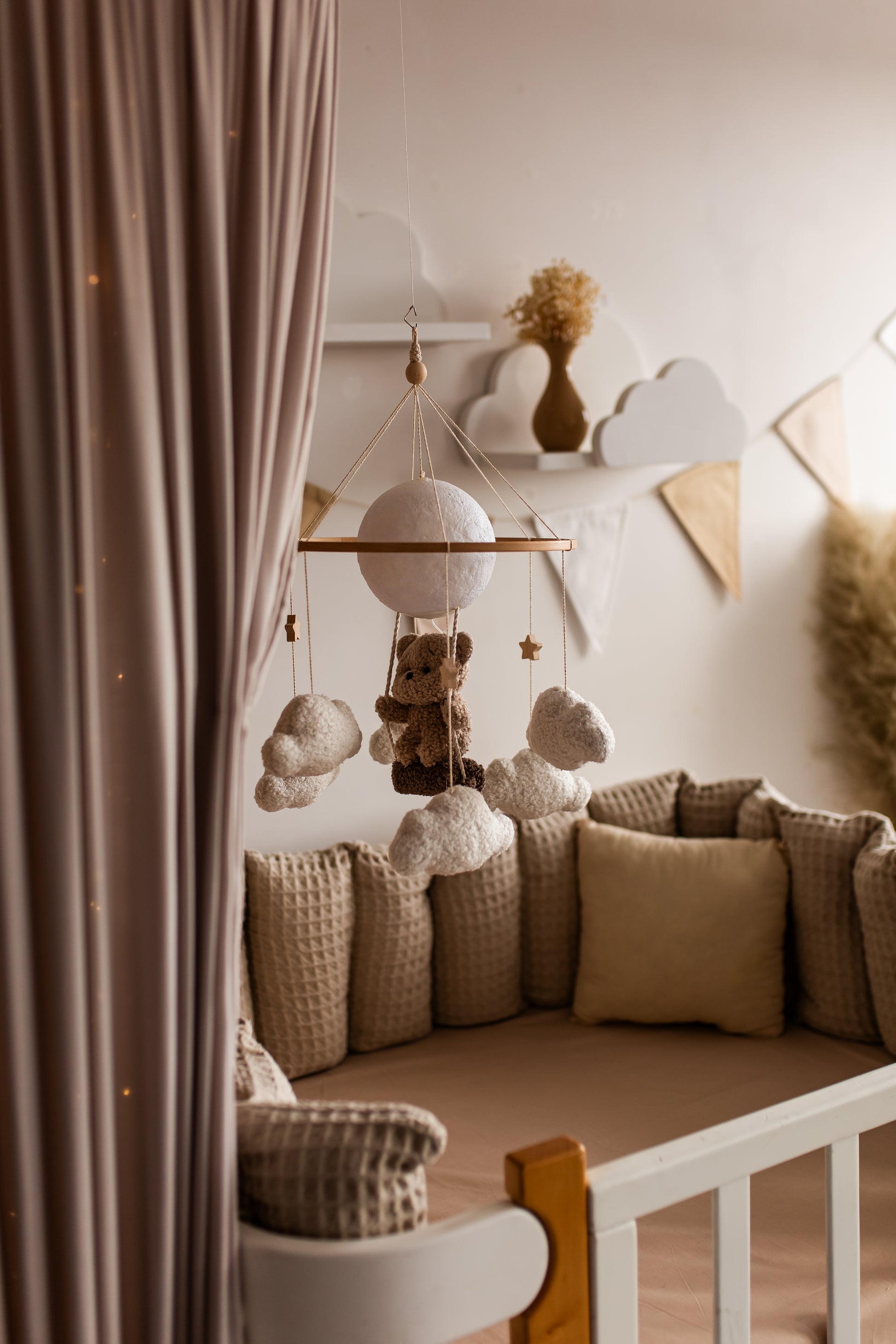 This magical night light mobile is designed to bring calm and comfort to your baby’s nursery. A fluffy teddy bear hugs a glowing moon surrounded by soft boucle clouds, creating a dreamy sky scene above the crib.